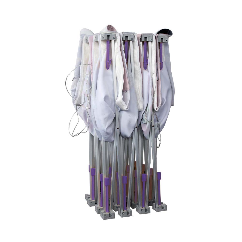 Die Textilfaltwand besteht aus Displaystoff, dieser hat das B1 Zertifikat für schwere Entflammbarkeit nach der in Deutschland geltenden Brandschutznorm. Somit ist er optimal für Innenanwendungen geeignet.